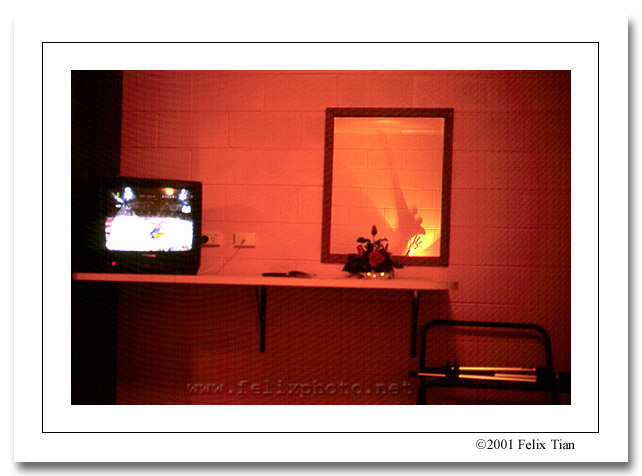 那人走过来,礼貌但不冷不热地说他是经理,今晚有空房,餐厅早已关门,但可以给我瓶可乐。我在他指定的顶头的房间前面停好车,环顾四周,一排平房前孤伶伶地只有我这一辆车,敢情我是这荒山野岭里的唯一投宿者,又和电影里一模一样!