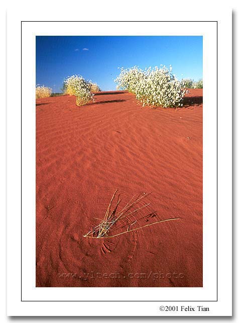 被前几天雨水打过的沙地松散湿润,散发着萌动春天的气息,散布在沙丘上的针状植物上已经绽出了朵朵小花。我挂档到四轮驱动上,停停走走,不时爬到驾驶室顶上取景,或是用微距镜头追寻沙漠蜥蜴的足迹。渐渐地,身后的公路早已不见踪影,沙丘越来越高,沙子也越来越松软。当我向前方最高的一个沙丘冲锋时,只听得发动机一阵空转,车子爬窝了。