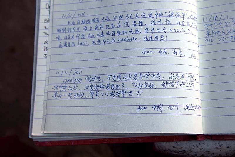 煎蛋的小摊位于尘土飞扬的古内城大门口,老板笑声朗朗,招呼我们坐在苍蝇横飞的长凳上,骄傲地递过来几大本厚厚的留言簿。翻开来,里面尽是各国文字,竟然有不少中文,有些留言相当捧腹。