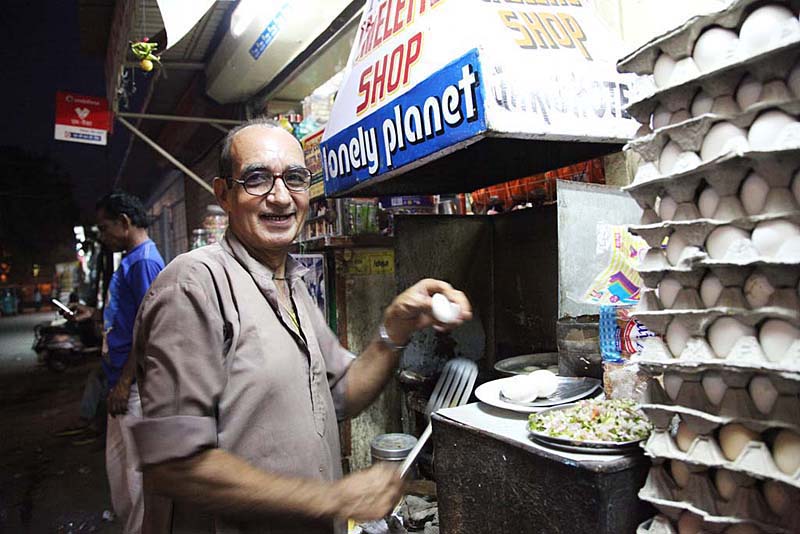 满怀希望地一口咬去。。。。。。味道还可以,不过我立刻破解了老板的秘密:他的调味酱实际上是Thousand Island 色拉酱,这种西餐里最常见的调味放在遥远印度的街头就成了治疗各国旅人乡愁的良药,让平常不过的鸡蛋和面包乘着乡愁扶摇而上,身价倍涨,竟然天下闻名。