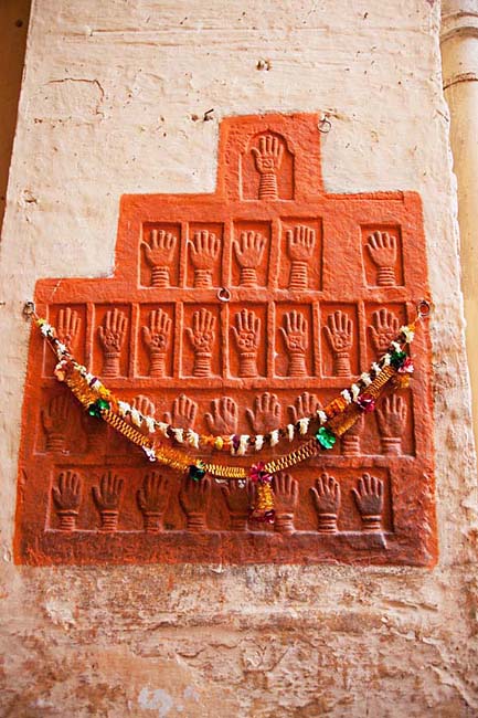 在一处城门侧墙上,刻有几十个红色的手印,据说那是当年众王妃在国王死后被投入火中殉葬前途经城门时留下的。