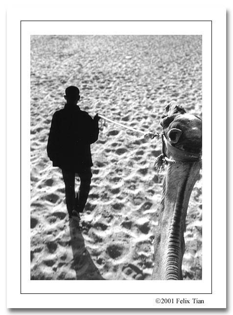 这是分秒必争的时刻,不能再往前走了。我急急地让伙计停下来,选好地点,另一个伙计也气喘吁吁地到了。身轻如燕的伙计手忙脚乱地帮我拉出三脚架腿,又非常机灵地把骆驼拉过来让它趴下给我作前景(他学得非常快),我跪在地上,趁着远处人影晃动,一梭子把一卷RVP打完。太阳落下去了。
