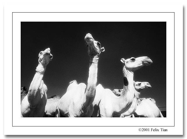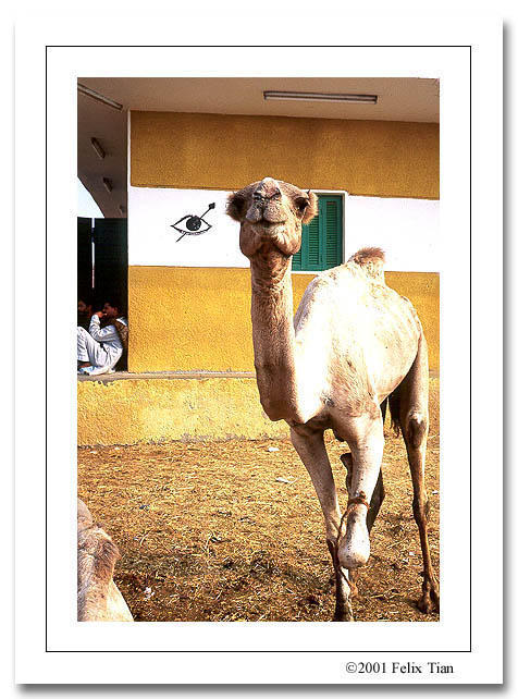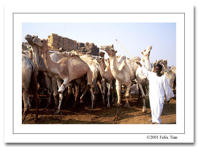 这是个并不很大的集市,粪便遍地,空气中散发着一股尿骚和干饲料的混合味道,我在里面走了不到50米,相机上就沾满了灰尘。市场里面至少有上千头骆驼在交易,这些都是单峰骆驼,一只腿被绑起来,于是只能象袋鼠一般一瘸一拐地跳着走。赶骆驼的人手一只木棍,打起骆驼来毫不留情,他们都着长衫但不包头,皮肤近似黑人。我问了一下,一匹骆驼的寿命约25年,要卖1500美金。