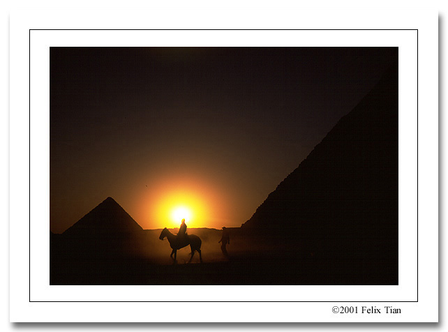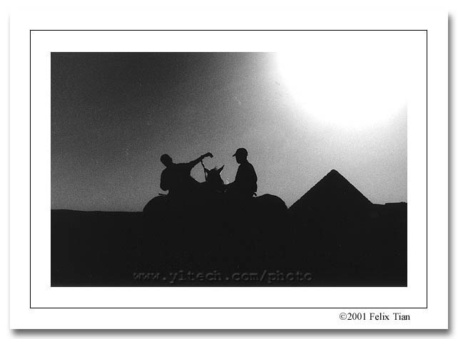 胡夫金字塔一如往日静静地座在斜阳里,孤寂而森严,打破那苍茫古韵的是学童们的欢闹和骆驼扬起的尘土,金字塔下不时有小伙子们趁着招揽游客的空闲赛马,两道冲天尘土里的迅疾蹄声让我想起了辛弃吉的词。一切还是这么圆满,一切还是这么埃及。
