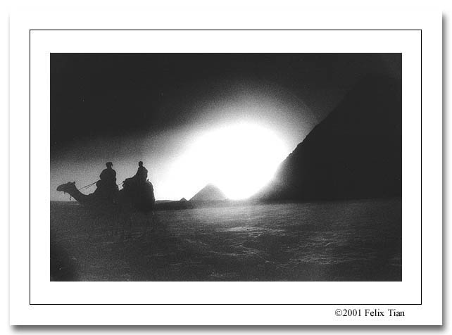 过了五点,金字塔周围只剩下我一个游人,夕阳也近地平线,我把三卷反转烧完,舒了口长气。这时那个小兵又走过来,没等他开口我就说我马上就走,哪儿想到他来了句:“不用急,你照吧,如果愿意我可以带你往里面走,到那个金字塔边上去照。”