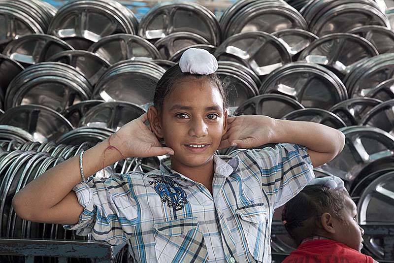 一楼露天凉棚下有不下千人在洗盘子。包着头巾、挎着腰刀的威武男人们从食客手中接过盘子,一手一个,把盘子在一个大不锈钢垃圾筒边缘上一磕,发出咣当一声巨响,然后一甩,两只飞碟就飞到另一个不锈钢桶里,又是咣当巨响; 有人飞快地把桶推到水池边,那里有数百名紧张忙碌的沙丽女子把盘子放到水龙头下冲,然后又是一甩,咣当,飞碟就飞到另一个桶里,最后有人把飞碟排好,咣当当地装到不锈钢车上,轰隆隆地推走。墙脚处有一排老人们在剥蒜,还有些大嫂们坐在沙箱旁用沙子在摩擦食客们用过的不锈钢小碗。