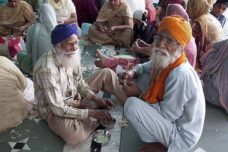 锡克人骁勇善战,在世界各地做保镖、雇佣兵的为数不少。不知为什么,金庙里身着蓝色长袍、橘色包头、手持长矛的寺庙守卫让我不禁想起了林彪麾下的四野。当年,那支来自东北的虎狼之师来不及换装就横扫大江南北,以至于头顶上的皮帽子成了令对手望风而逃的夺命符。