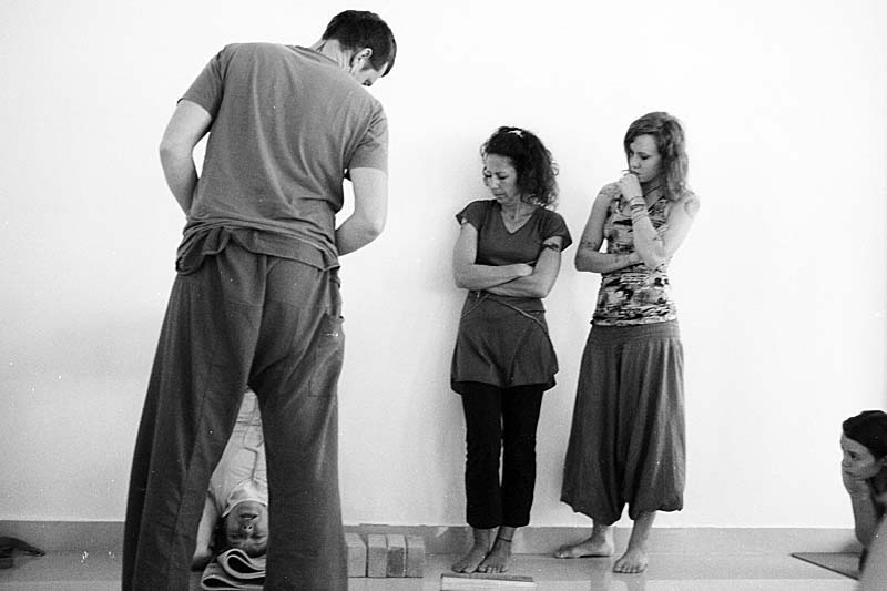 宗师开始高密度地教导一些要领, 一边示范一边高喊口令, 声若洪钟 。他讲的是印度话,年轻的瑜伽师在一旁翻译。宗师在学员间巡视的时候会突然劈出一个手势,冒出一句英语,逗得大家哈哈大笑。不愧为有八十年教学经验的导师,气氛和节奏控制得无懈可击。