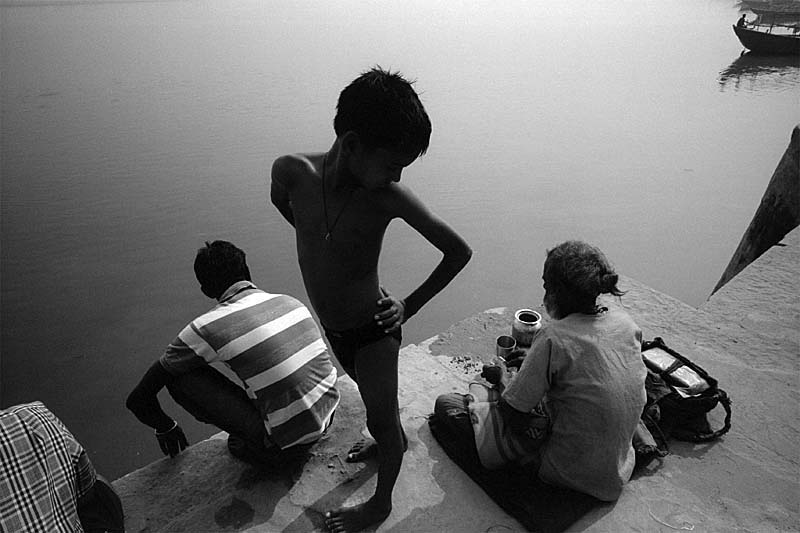 下午,我正在恒河沙滩上聚精会神地对着一头白牛取景,一回头,发现一只镜头正对着我,原来是S美眉蹲在后面。她拿了一台尼康数码机,比较独特的是用一只85/1.4作为旅行挂机头。不远处蓝妹妹坐在岸边东张西望,小镇并不大。