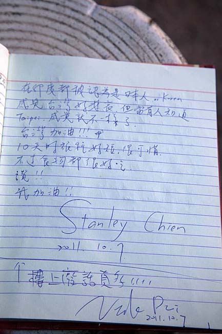 煎蛋的小摊位于尘土飞扬的古内城大门口,老板笑声朗朗,招呼我们坐在苍蝇横飞的长凳上,骄傲地递过来几大本厚厚的留言簿。翻开来,里面尽是各国文字,竟然有不少中文,有些留言相当捧腹。