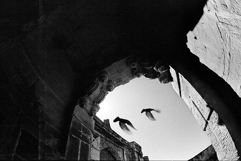 王宫里除了石头,还是石头--巍峨的宫墙、门庭是精雕细刻的石头;轻灵的窗棂、屋檐是更加精雕细刻的石头。大群的鸽子在高墙壁垒间扑闪腾冲,咕咕有声。